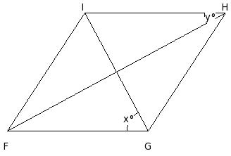 In the given figure, FGHI is a rhombus. Given x = 62°, find the value of 'y'.