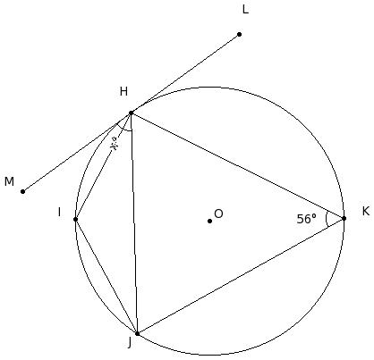 In the given figure, O is the centre of the circle and LM is the tangent at H. If ∠HKJ = 56°, find ∠MHJ