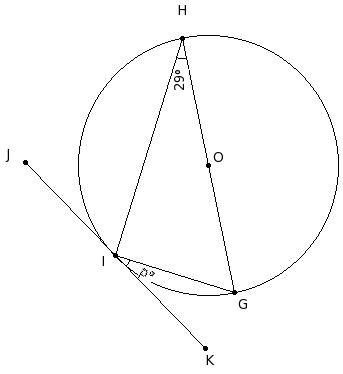 In the given figure, O is the centre of the circle and JK is the tangent at I. If ∠IHG = 29°, find ∠KIG