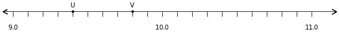 Find the sum of the decimal numbers at the points labelled with letters U and V