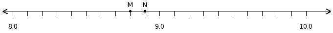 Find the difference of the decimal numbers at the points labelled with letters M and N