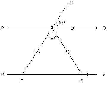 In the given figure, PQ ∥ RS, ∠HEQ = 57° and EF = GE. Find the measure of x.
