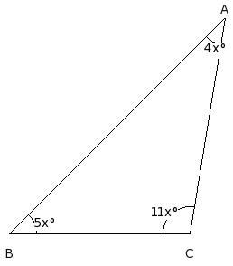 One angle of a triangle measures 45° and the other two angles are in the ratio 4 : 11. Find these angles.