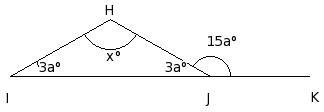 In the given figure, △HIJ in which side IJ has been produced to K. If ∠JHI = x° , ∠HIJ = (3a)° , ∠IJH = (3a)° and ∠HJK = (15a)°, find the values of a and x.
