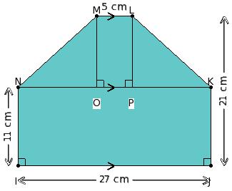 Find the area of the shaded region of the adjoining figure, given that ∠NIJ = ∠KJI = 90°, ML ∥ IJ ∥ NK, MO ⟂ NK, LP ⟂ NK, NO = PK, IJ = 27 cm, IN = 11 cm, ML = 5 cm and distance between IJ and ML is 21 cm