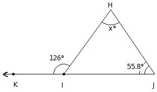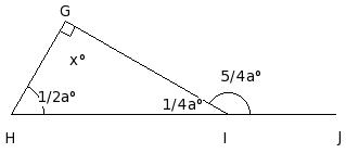 In the given figure, △GHI in which side HI has been produced to J. If ∠IGH = x° , ∠GHI = (1/2a)° , ∠HIG = (1/4a)° and ∠GIJ = (5/4a)°, find the values of a and x.