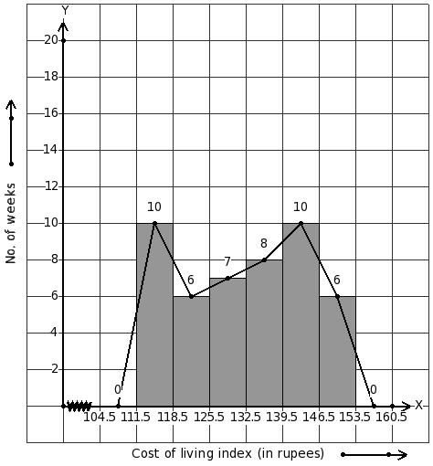 Given below is the cost of living index for a particular year in a city. Identify the class interval table for the given histogram and frequency polygon on the same graph.