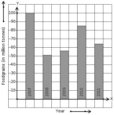 Read the column-graph given below. Find the year that has minimum food grains production.