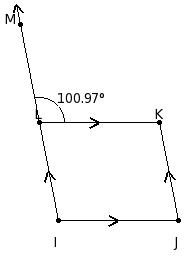 In the adjoining figure, side LI of parallelogram IJKL has been produced to M. If ∠KLM = 100.97° , find the measure of each angle of the parallelogram.