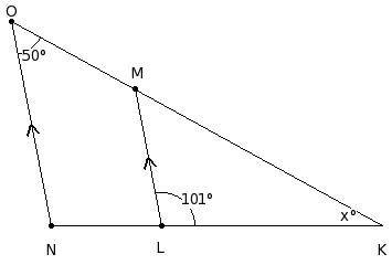In the given figure, it is given that ML ∥ ON , ∠MON = 50° and ∠MLK = 101°. Find the value of x.