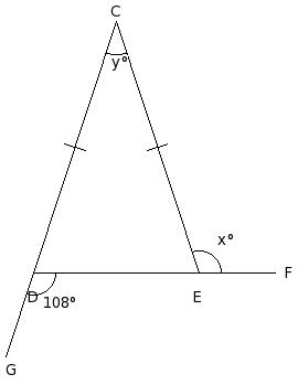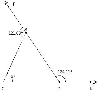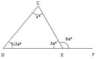 In the given figure, △CDE in which side DE has been produced to F. If ∠ECD = x° , ∠CDE = (5/2a)° , ∠DEC = (3a)° and ∠CEF = (6a)°, find the values of a and x.