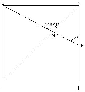 In the adjoining figure, IJKL is a square. A line segment LN cuts the side JK at N and the diagonal IK at M such that ∠LMK = 106.91° and ∠MNK = x°. Find the value of x .