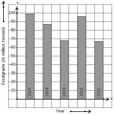 Read the column-graph given below. Find the year that has 96 million tonnes food grains production.