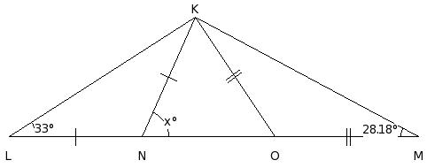 In the given figure, if NK = LN and KO = OM , find the value of x.