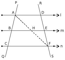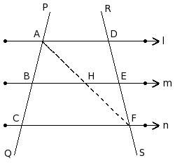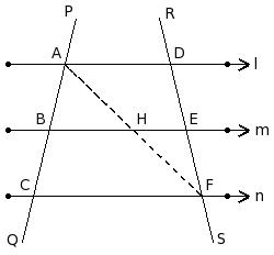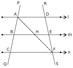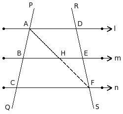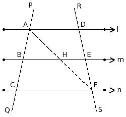 Two transversals PQ and RS intersect them at the points A , B , C and D , E , F respectively.