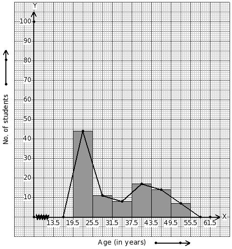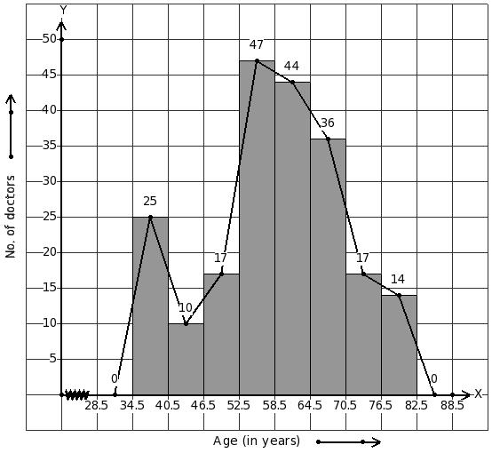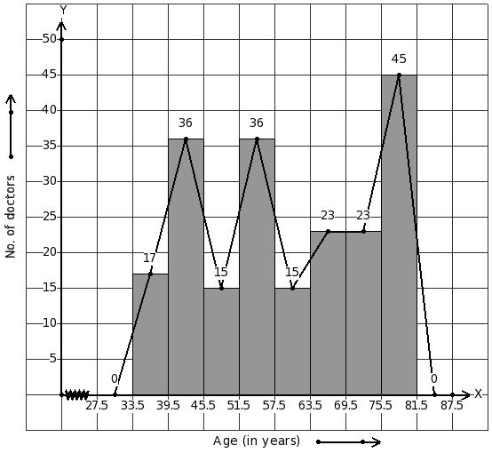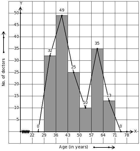 Given the number of doctors working in government hospitals in a city in various age groups. Identify the class interval table for the given histogram and frequency polygon on the same graph.