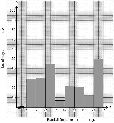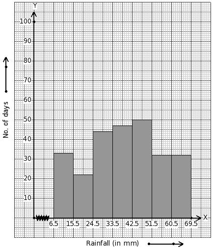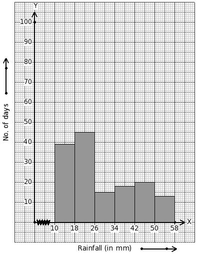 Rainfall of 150 days (in mm) are given below. Identify the class mark table for the given histogram.