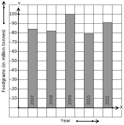 Read the column-graph given below. Find the year that has minimum food grains production.