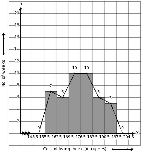 Given below is the cost of living index for a particular year in a city. Identify the class interval table for the given histogram and frequency polygon on the same graph.
