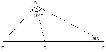 In the given figure, G is a point on side EF of △DEF such that ∠FDE = ∠DGF = 104° , ∠GFD = 28°. Find ∠FDG