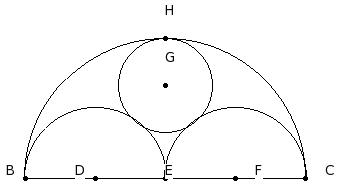 BC is a line segment and E is its mid-point. Three semi-circles are drawn with BE , EC and BC as diameters. D , F and E respectively are the centres of these semi-circles. A new circle is drawn touching these three semi-circles. Find its radius, given BD = 7 cm |