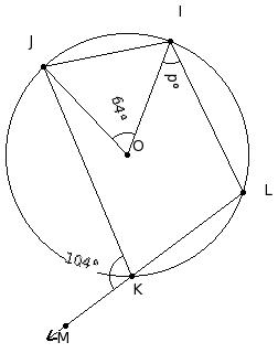 In the given figure, O is the centre of the circle. If ∠IOJ = 64° and ∠JKM = 104°, find ∠LIO