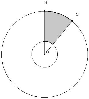In the given figure, arcs of two concentric circles of radii 15.00 cm and 4.50 cm are drawn with center O. If ∠GOH = 40°, find the area of the shaded region