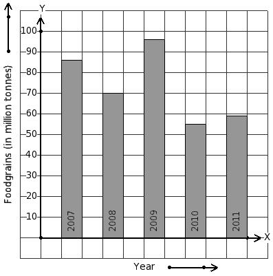 Read the column-graph given below. Find the year that has maximum food grains production.