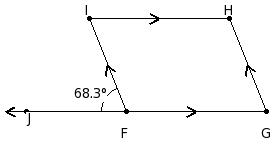 In the adjoining figure, side FG of parallelogram FGHI has been produced to J. If ∠IFJ = 68.3° , find the measure of each angle of the parallelogram.