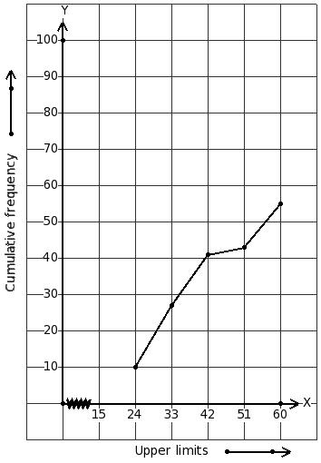 The marks obtained by 42 students of a class in an examination is given below. Identify the frequency distribution table for the given less than ogive.