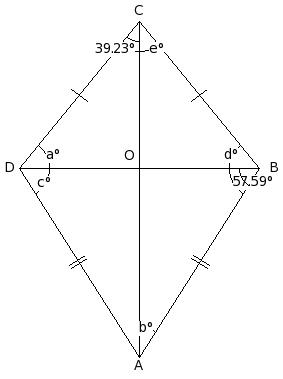 If ∠OCD = 39.23° and ∠ABO = 57.59°, find the measure of each of the angles marked a,b,c,d and e.