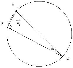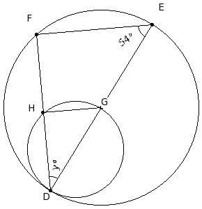 Two circles touch internally. G is the centre of the bigger circle and lies on the smaller circle. If ∠DEF = 54°, find ∠D