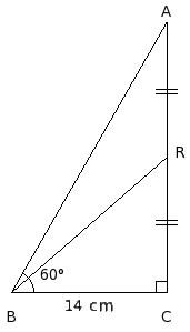 In the given figure, △ABC is a right angle triangle with ∠C = 90° and BC = 14 cm. R is the mid-point of AC. Find RC