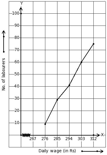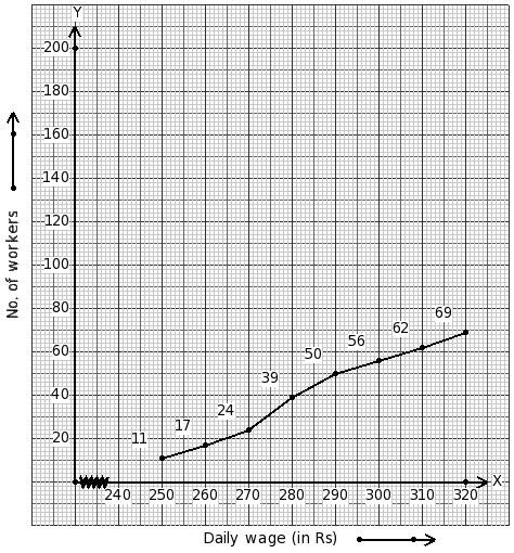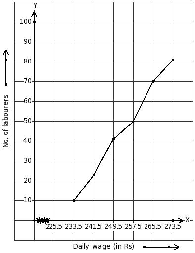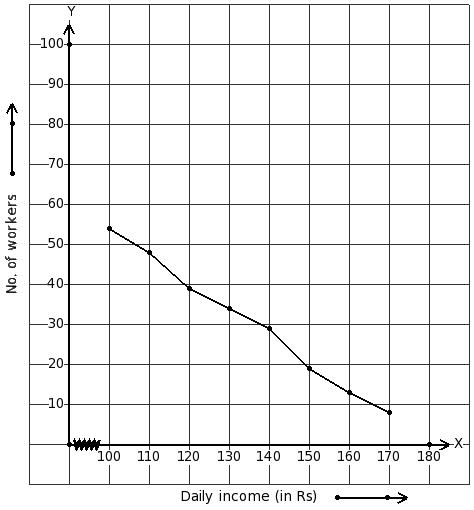 The following ogive shows the daily wages of workers in a factory. Estimate the median.